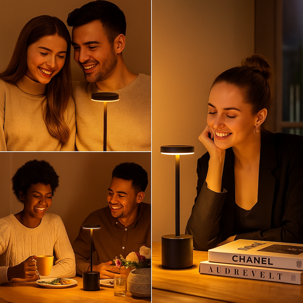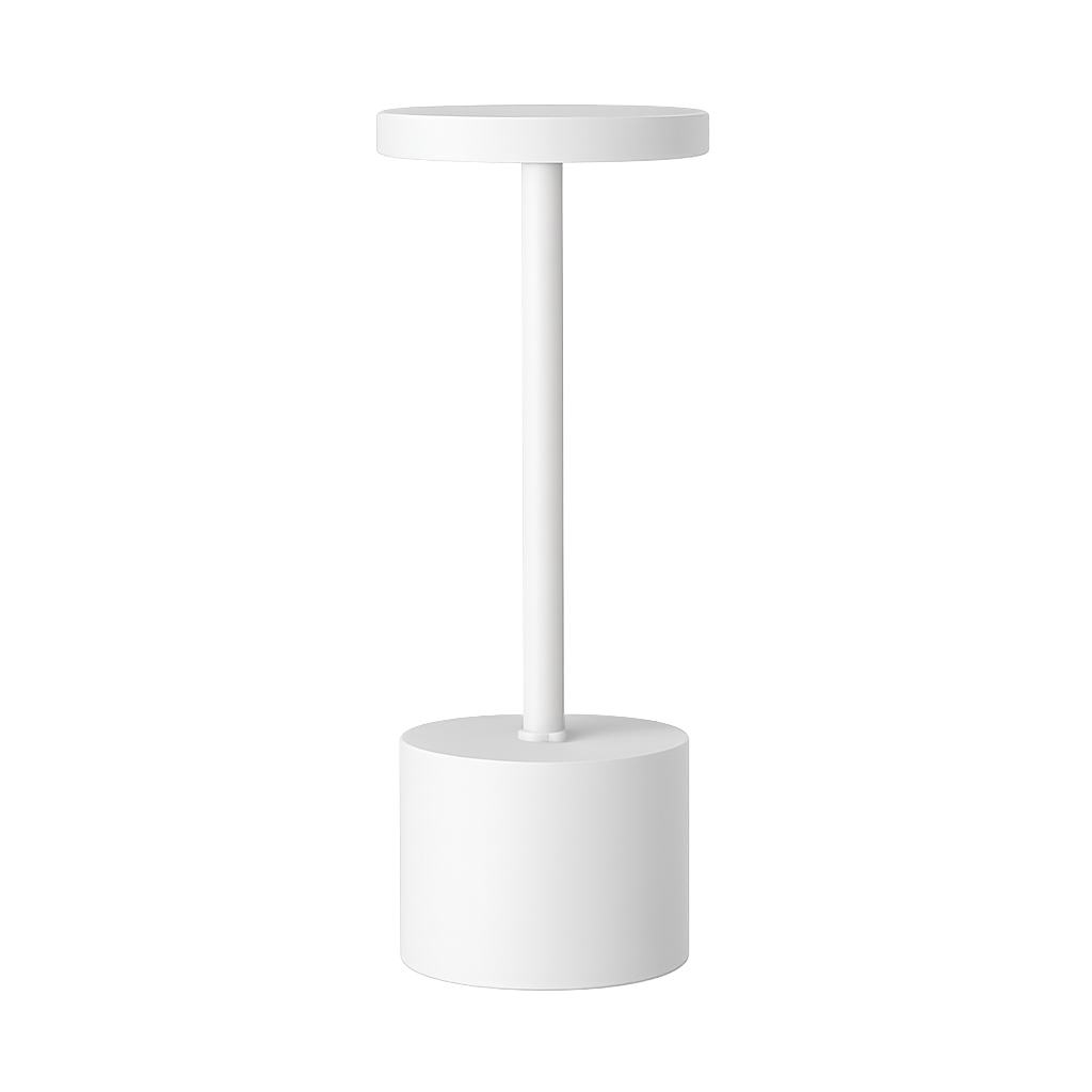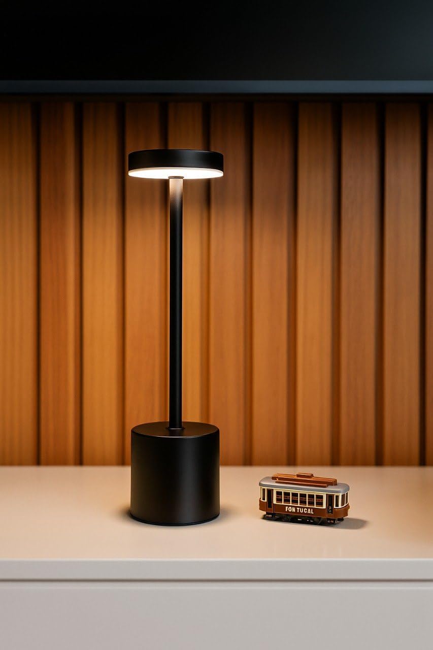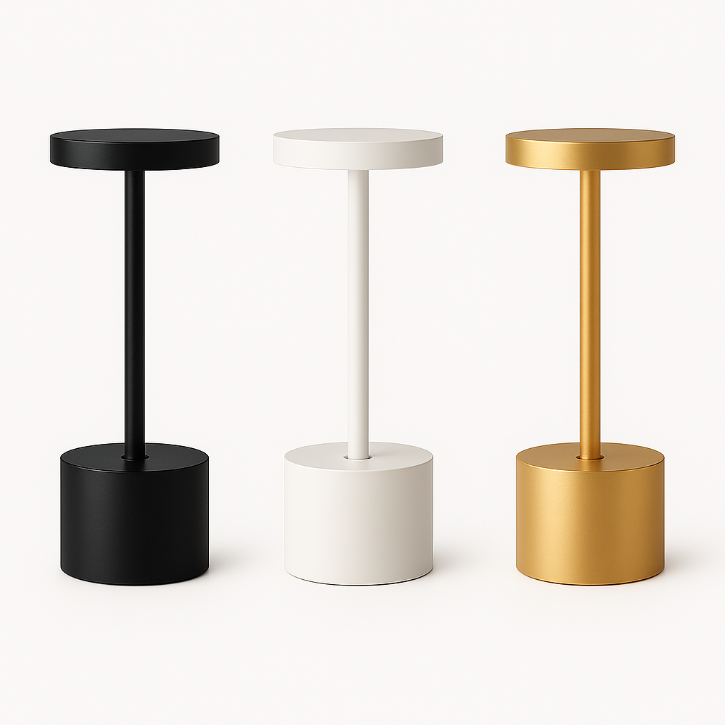 O design minimalista preto, branco ou dourado eleva qualquer ambiente, enquanto a bateria de 8 a 12 horas acompanha sua noite inteira sem depender de tomada. Toque no topo para ligar, toque de novo para alternar a cor da luz — Âmbar para jantares acolhedores, Neutro para foco e produtividade, Puro para leitura nítida — e toque para desligar.